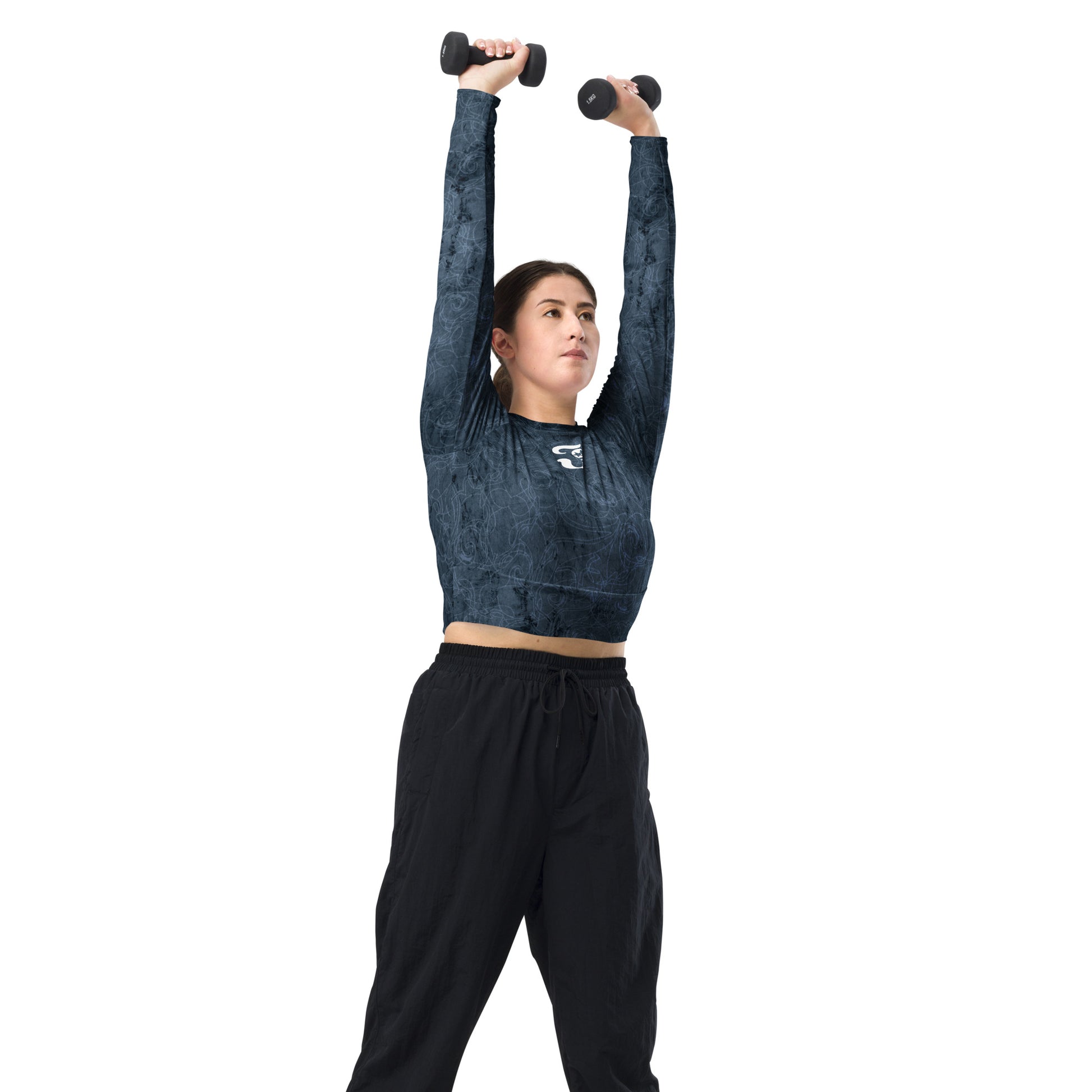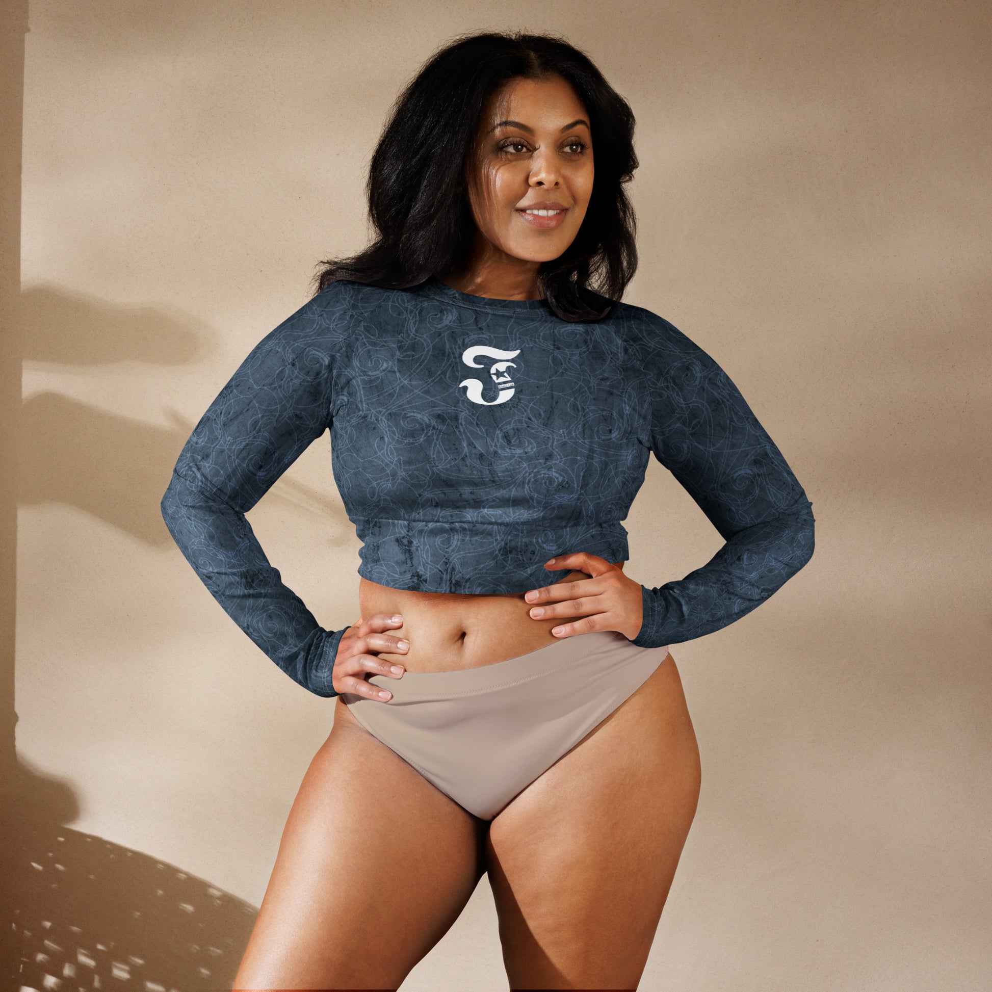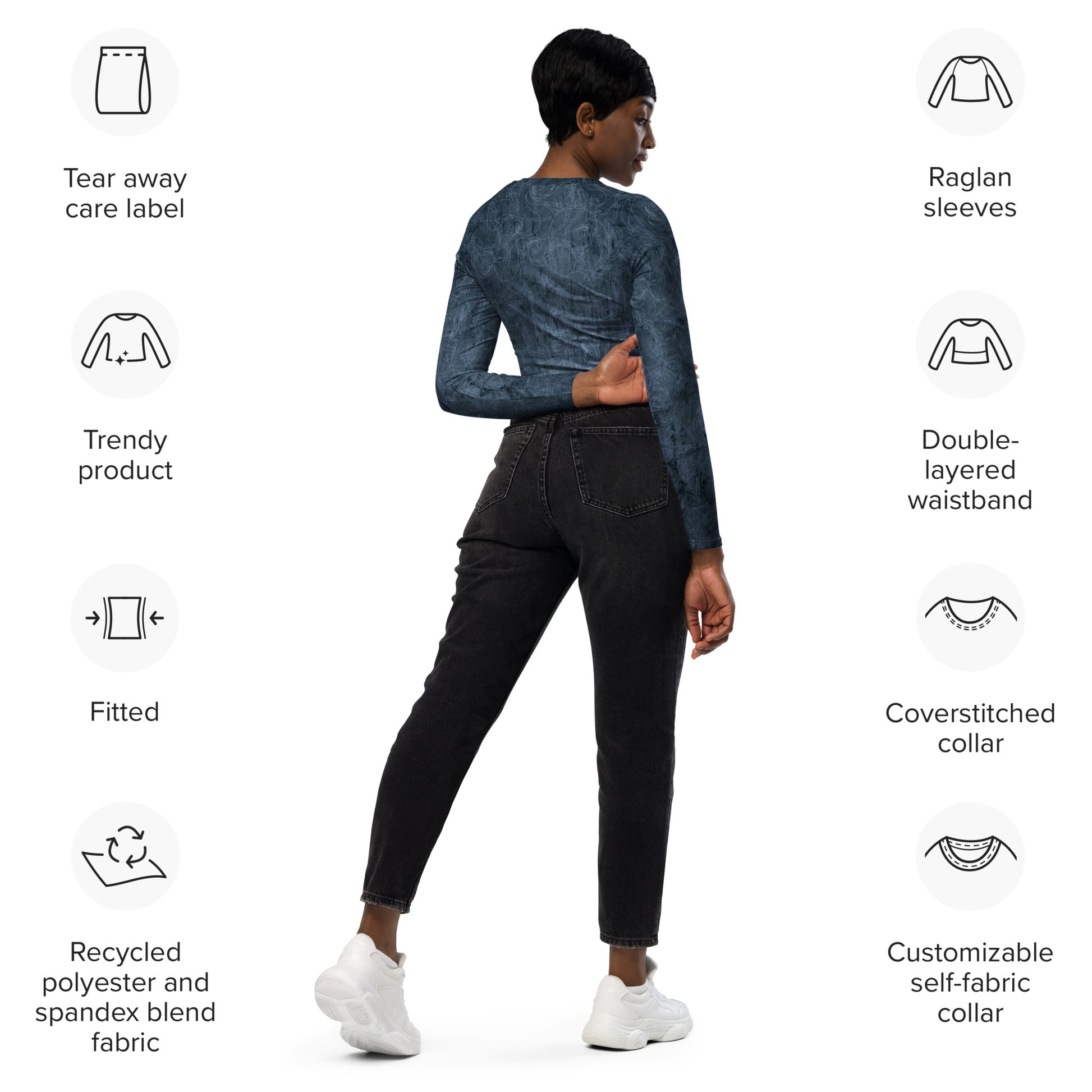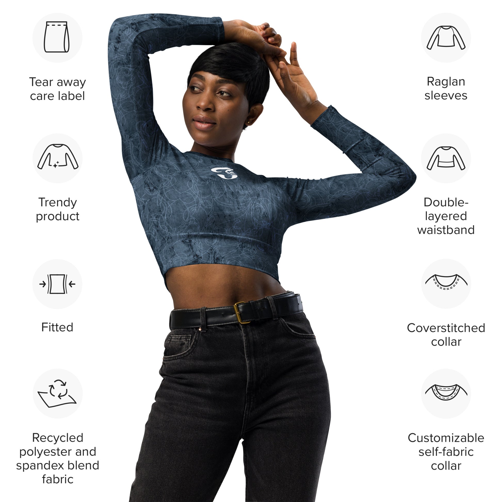 This long-sleeve crop top is made of recycled polyester and elastane, making it an eco-friendly choice for swimming, sports, or athleisure outfits. The crop top has a tear-away care label and a wide, double-layered waistline band for a comfortable fit.