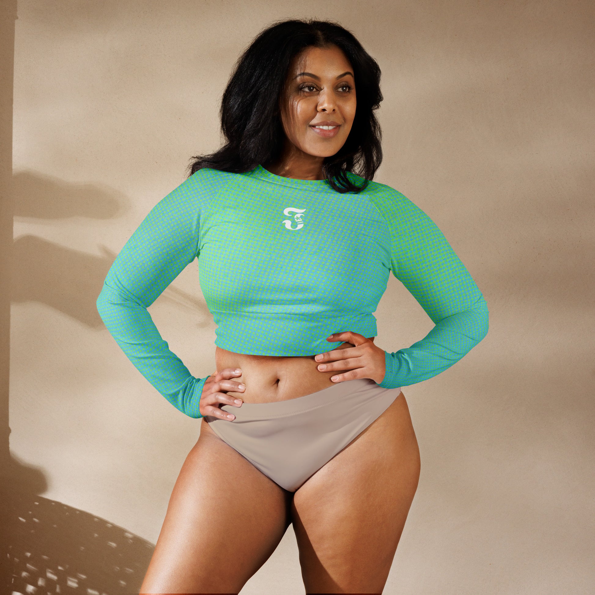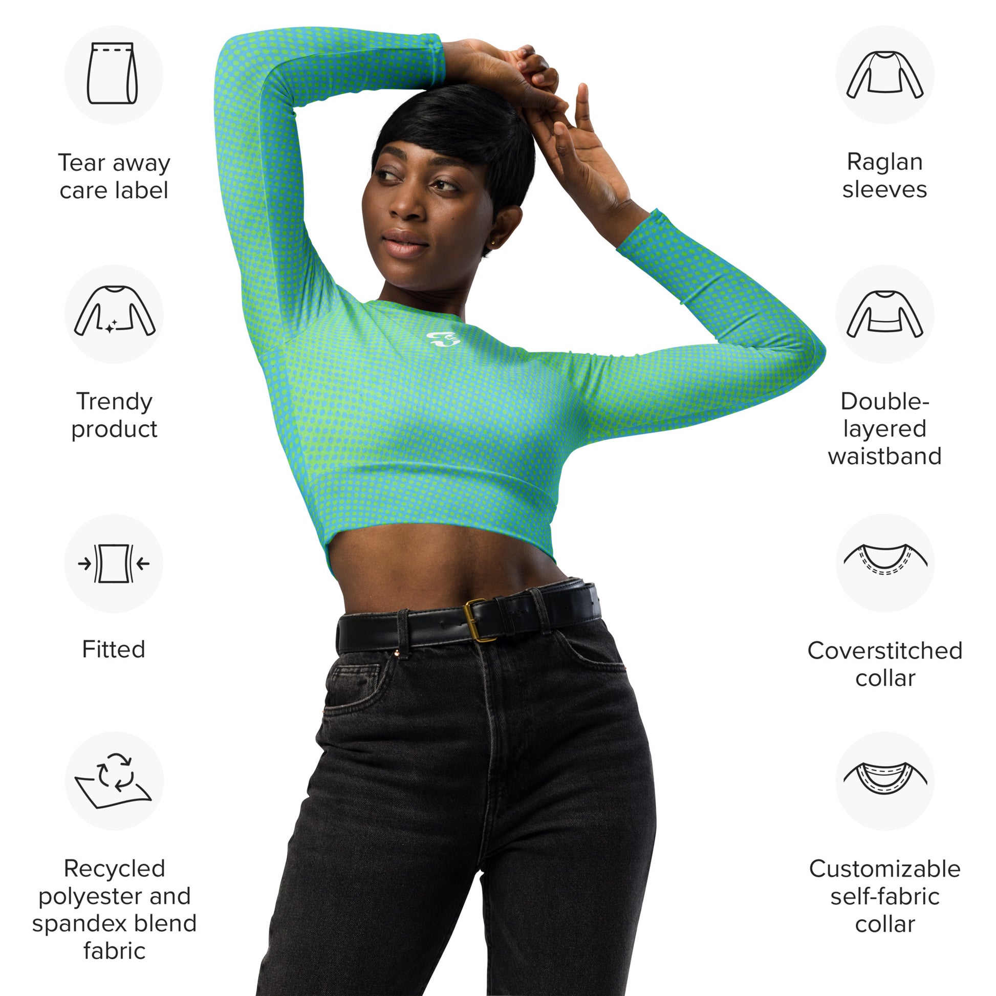 This long-sleeve crop top is made of recycled polyester and elastane, making it an eco-friendly choice for swimming, sports, or athleisure outfits. The crop top has a tear-away care label and a wide, double-layered waistline band for a comfortable fit.
